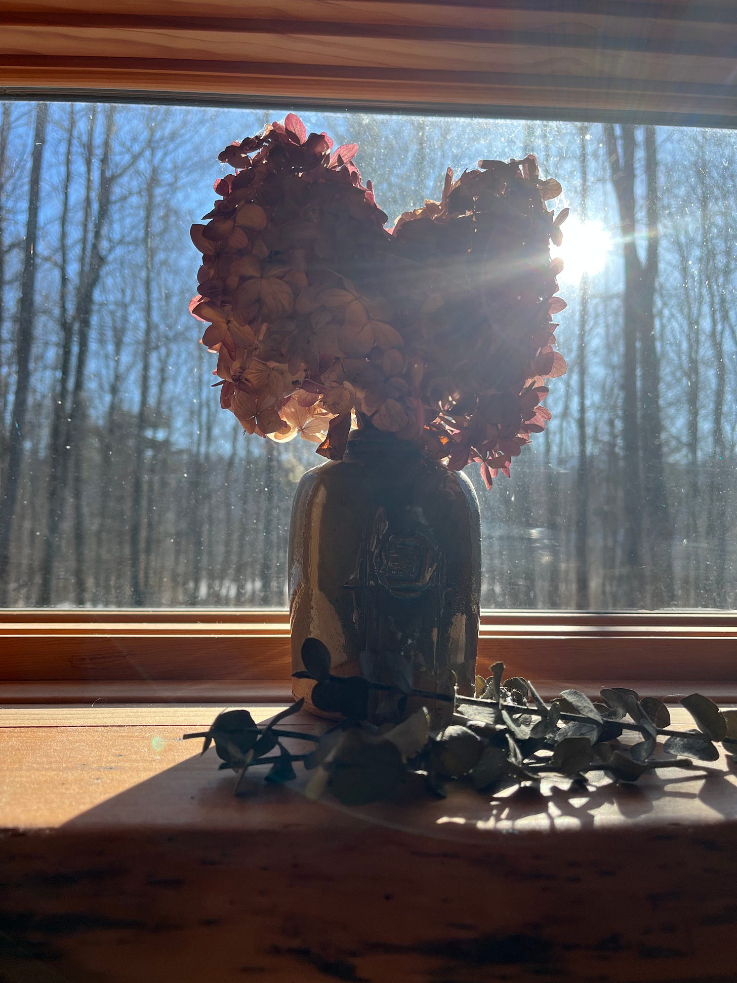 in the kitchen window, dried hydrangeas