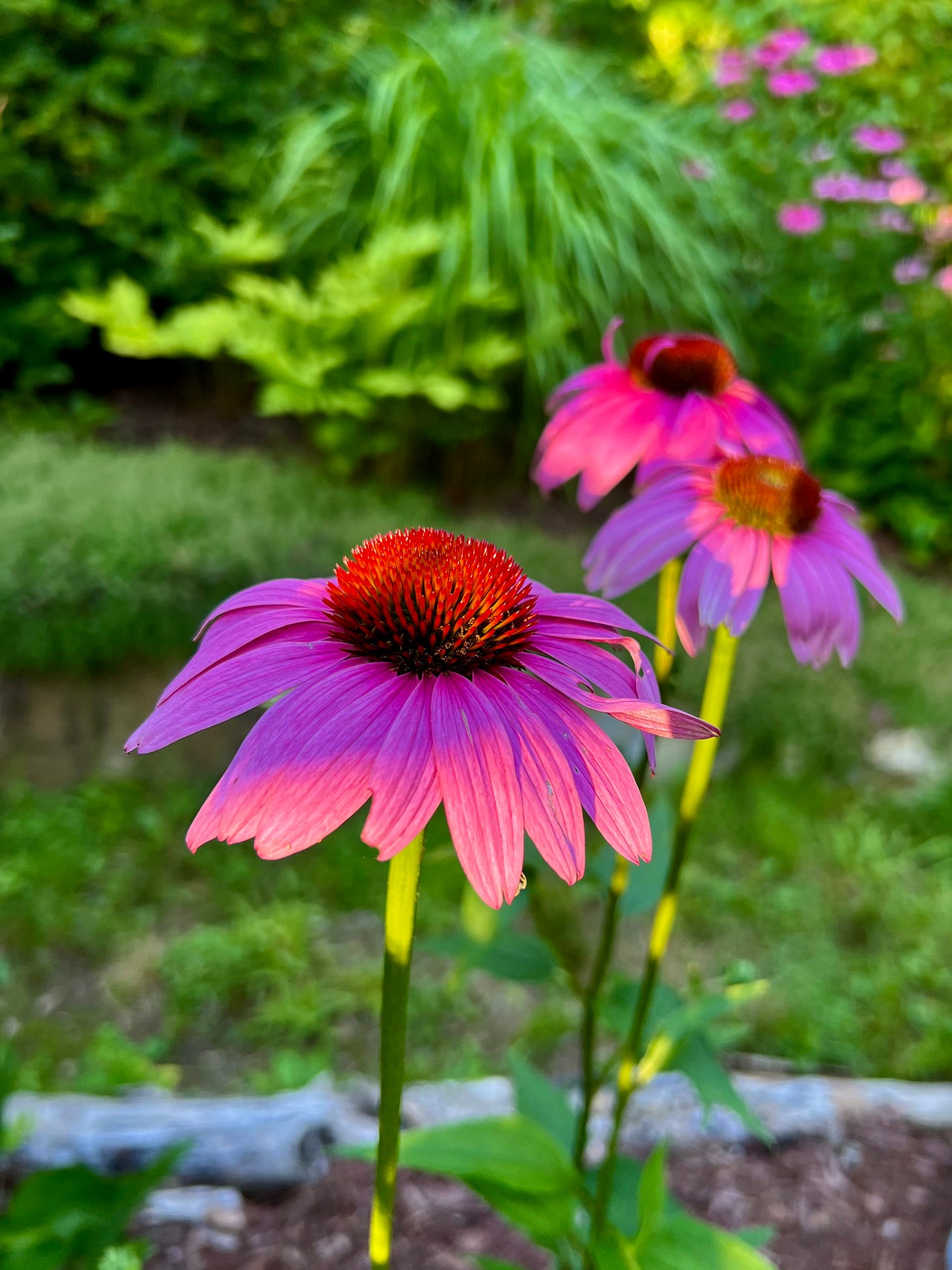perched on the tops of coneflowers