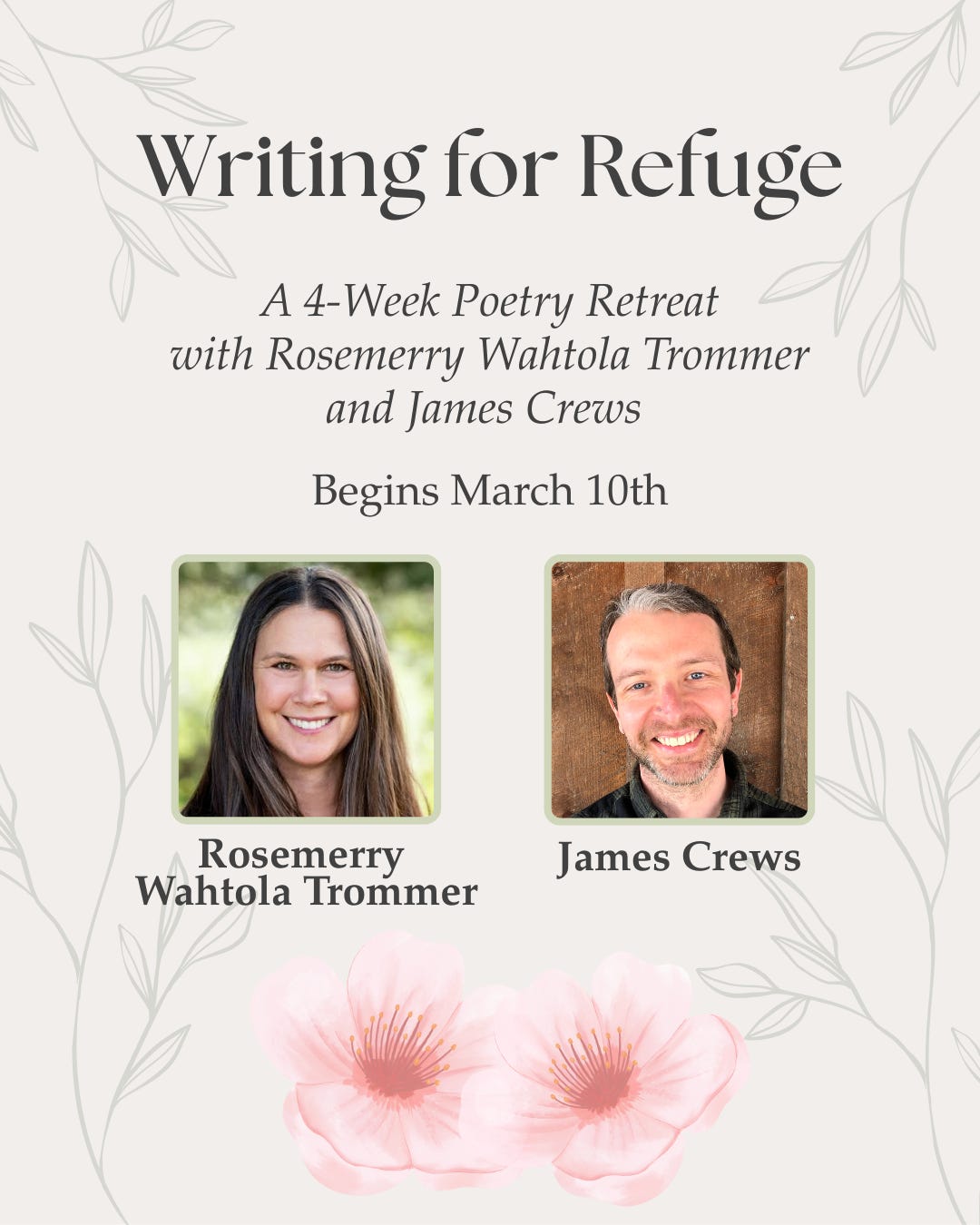 If you’re looking for some creative communion this spring, please consider joining me for Writing for Refuge: 4 Week Poetry Retreat via Zoom with Rosemerry Wahtola Trommer, Tuesdays at 12pm ET starting 3/10. $250 to join. We have a few half-off scholarships still available; just message me for more info. Each session is recorded and shared: